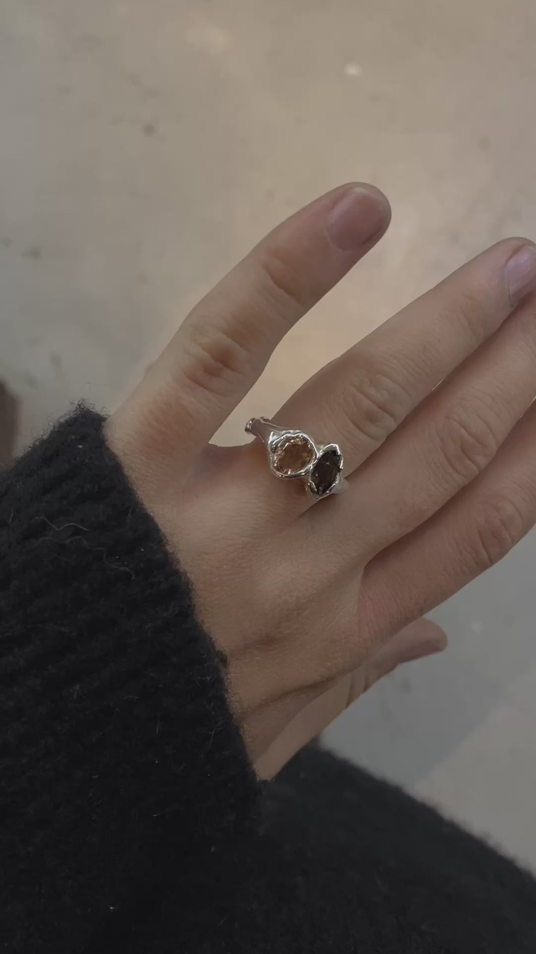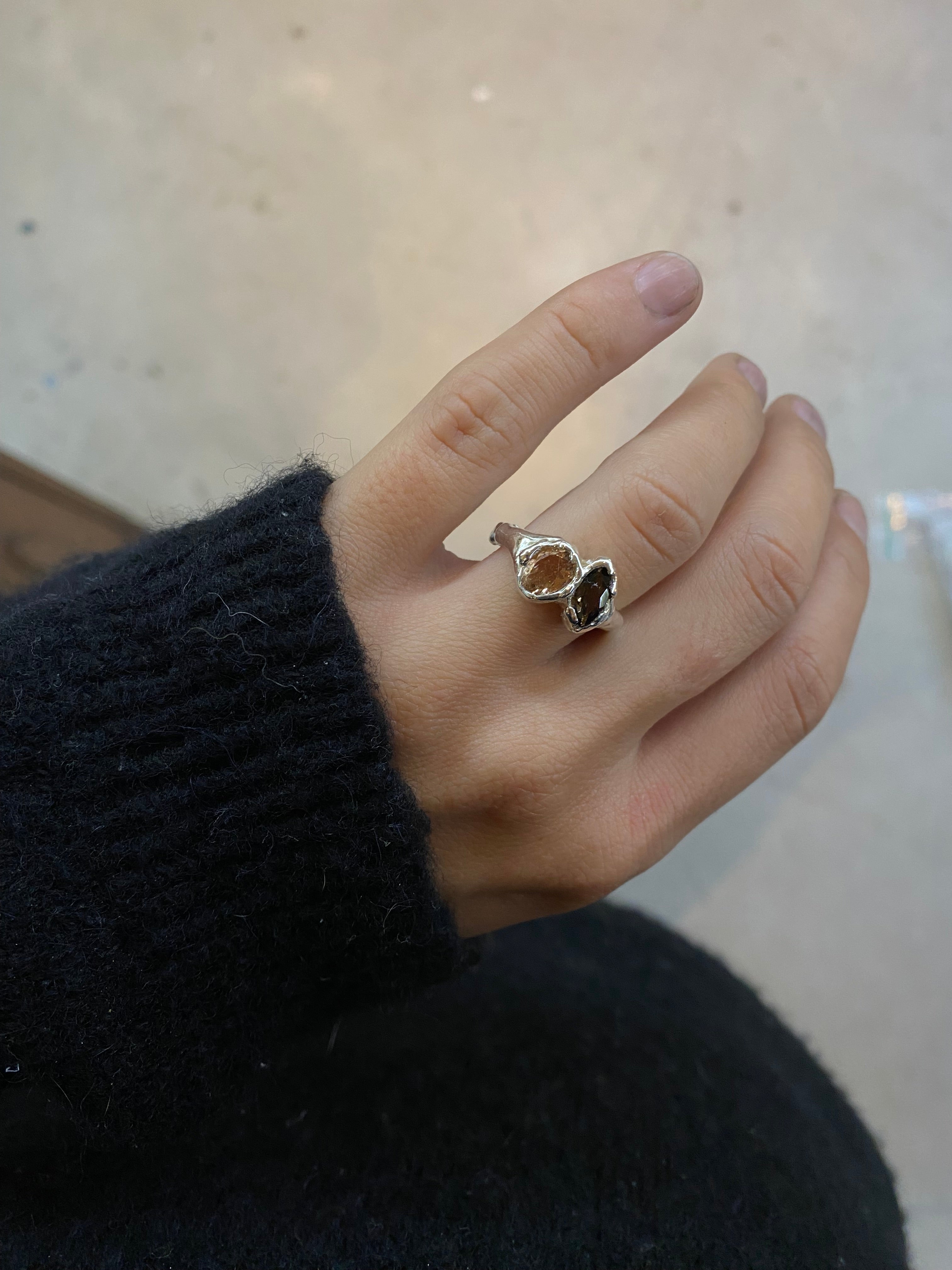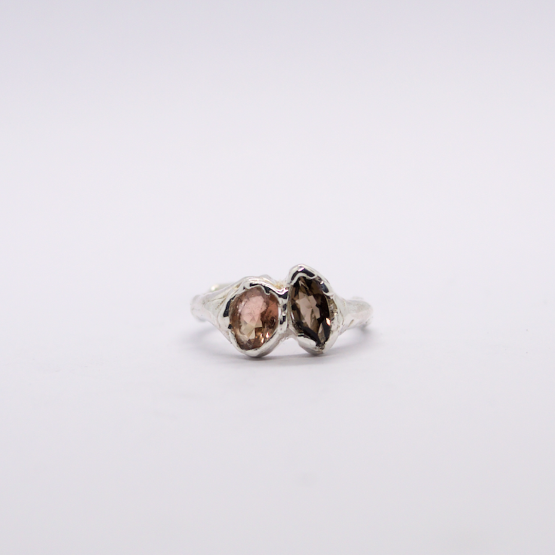 Bague en argent 925, ornée d’un duo de pierres : une tourmaline et un quartz fumé, offrant un contraste naturel et subtil.