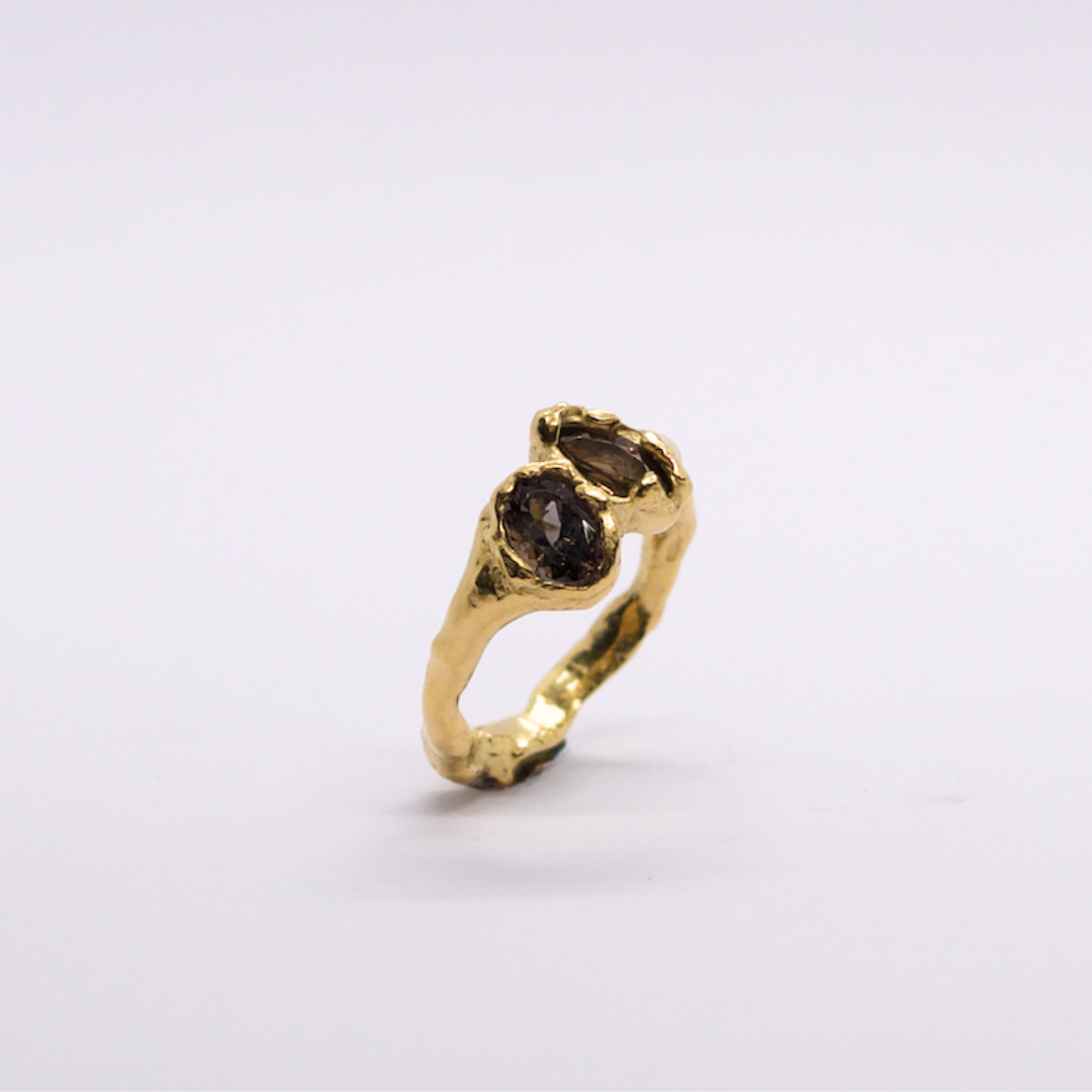 Bague en vermeil (argent 925 plaqué or 18K – 5 microns), ornée d’un duo de pierres : une tourmaline et un quartz fumé, offrant un contraste naturel et subtil.