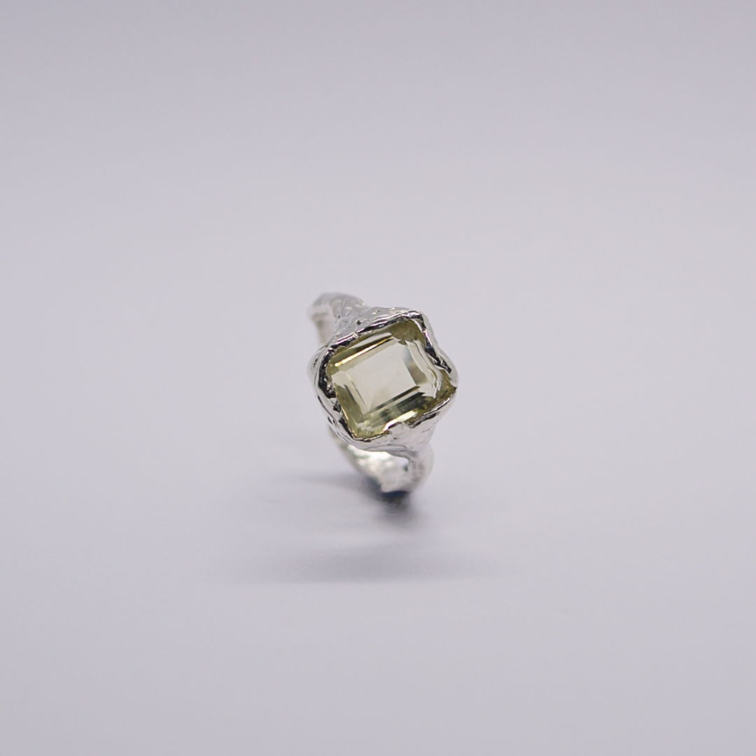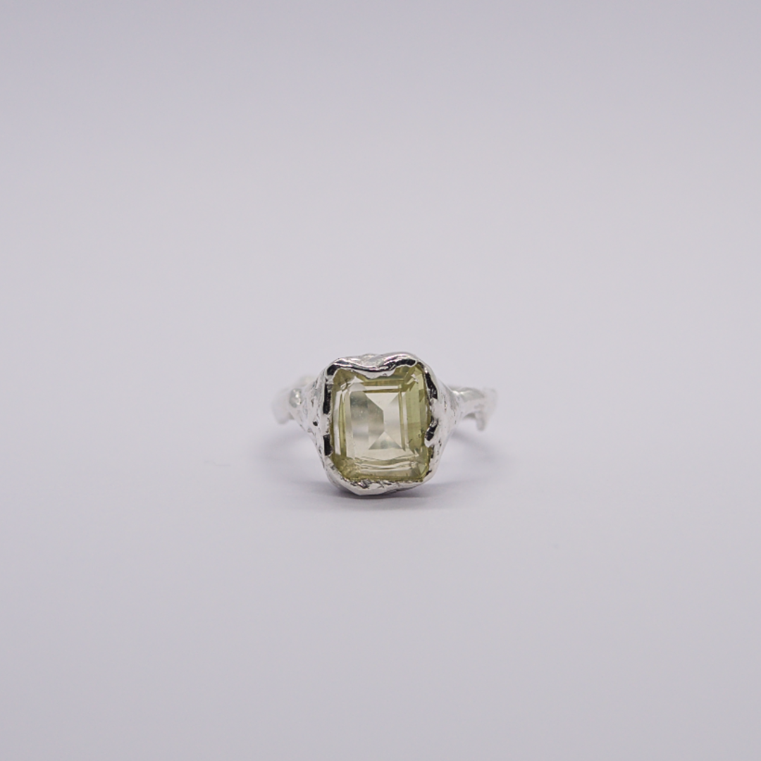 Bague en argent 925, sertie d’une prasiolite de 10x8mm. Disponible en taille 55 – non ajustable, aucune remise à taille possible.