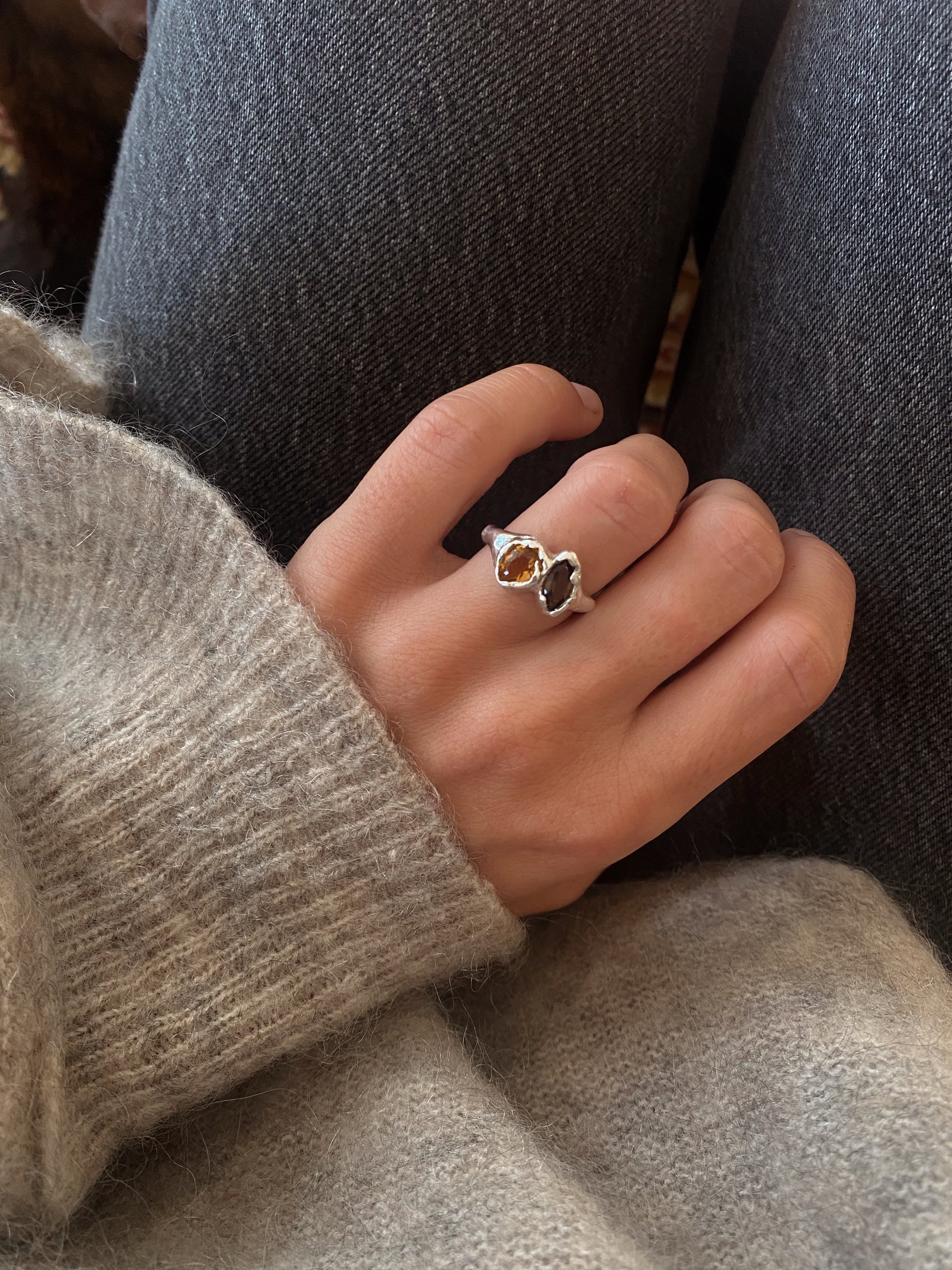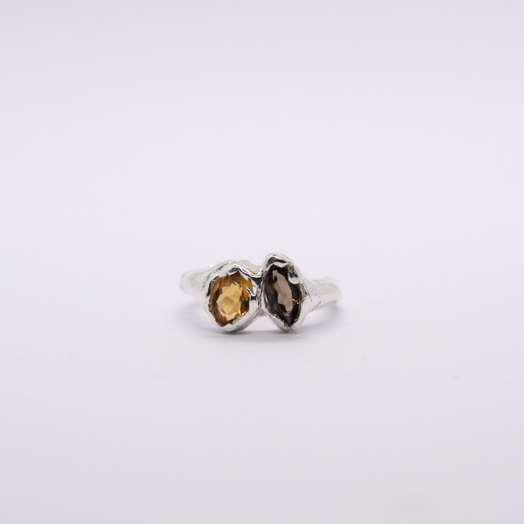 Bague en argent 925, ornée d’un duo de pierres : une citrine et un quartz fumé, offrant un contraste naturel et subtil.