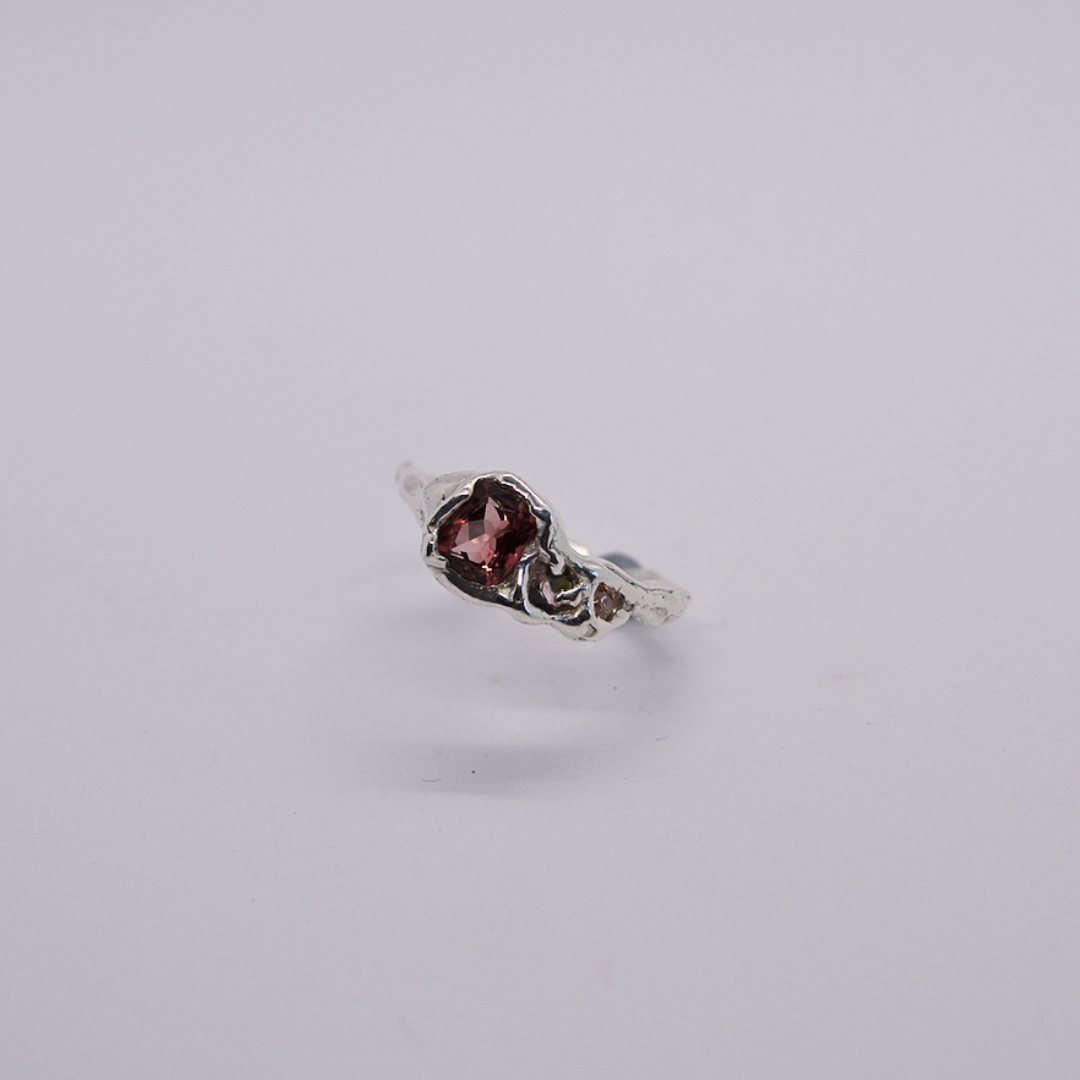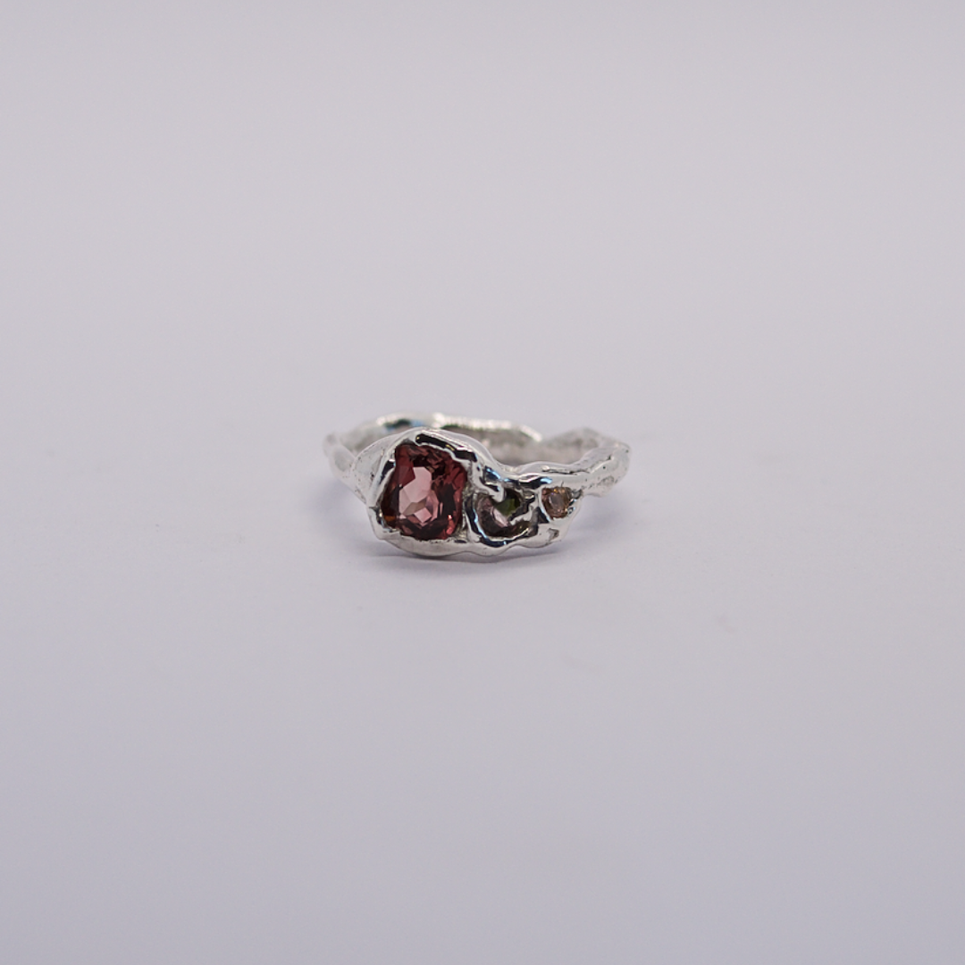 Anneau en argent 925 massif ou en vermeil (argent plaqué or 5 microns), serti de deux tourmalines (rose foncée et bicolore) et d’une petite morganite rose. Disponible en taille 55.