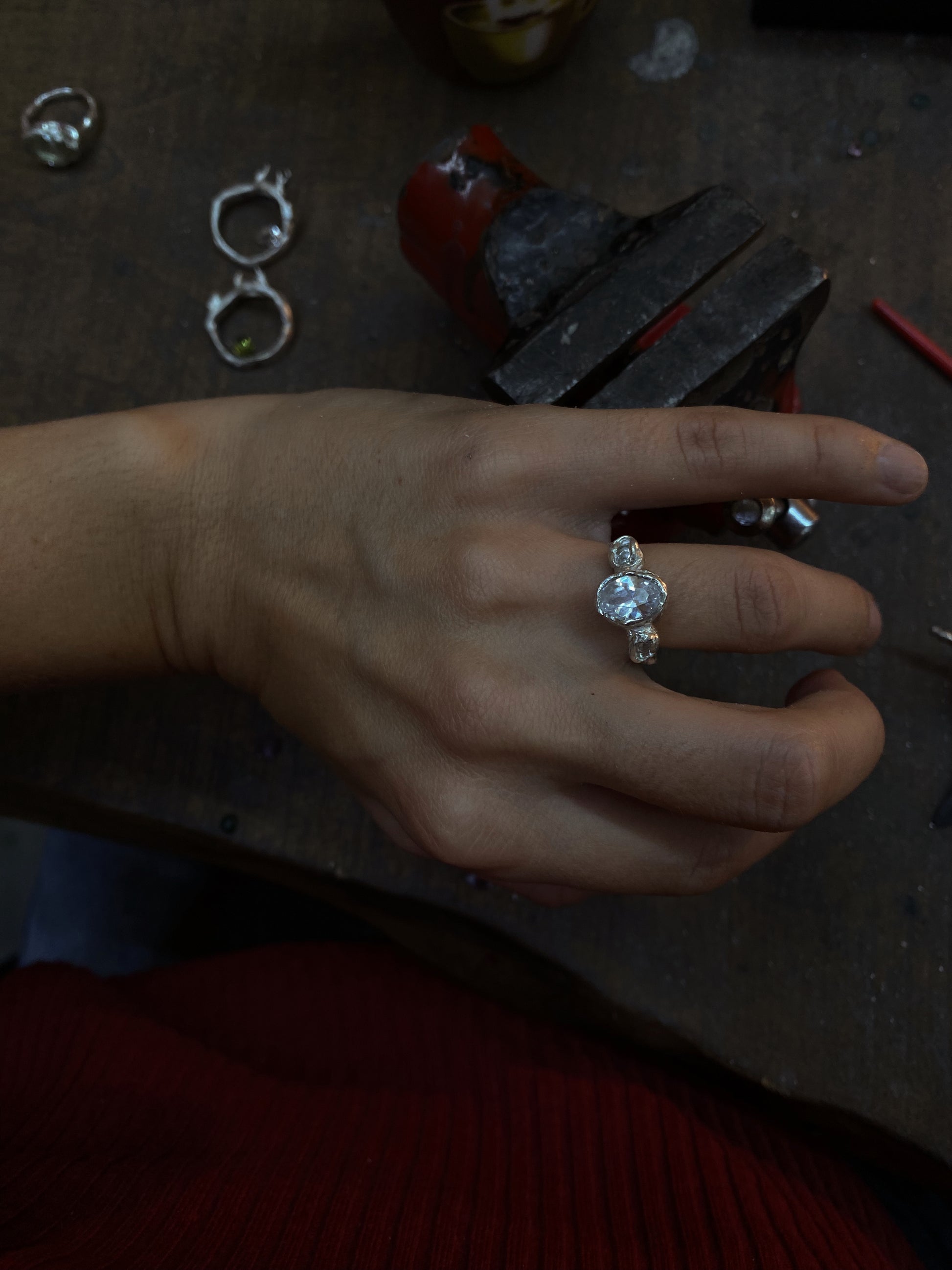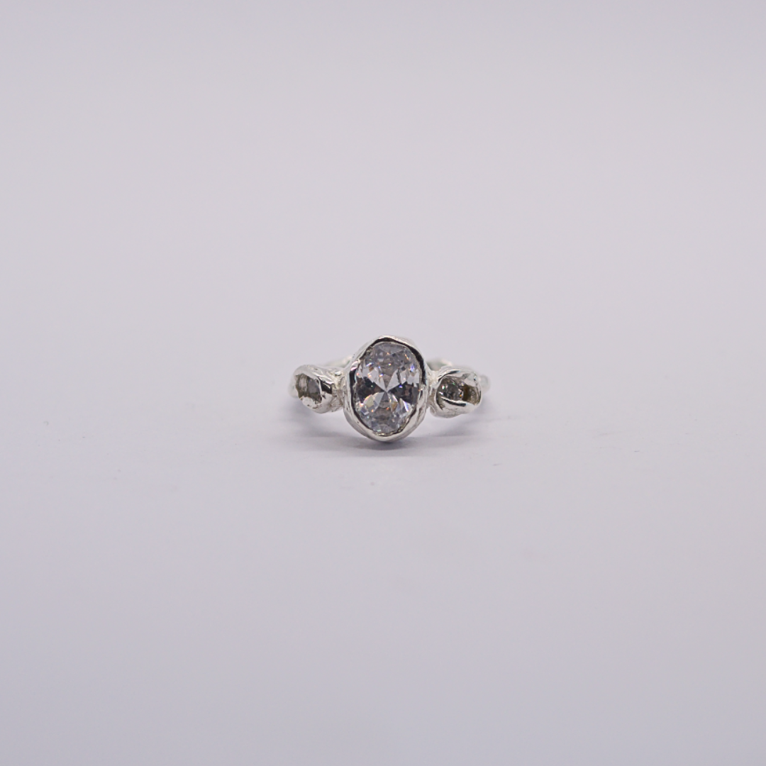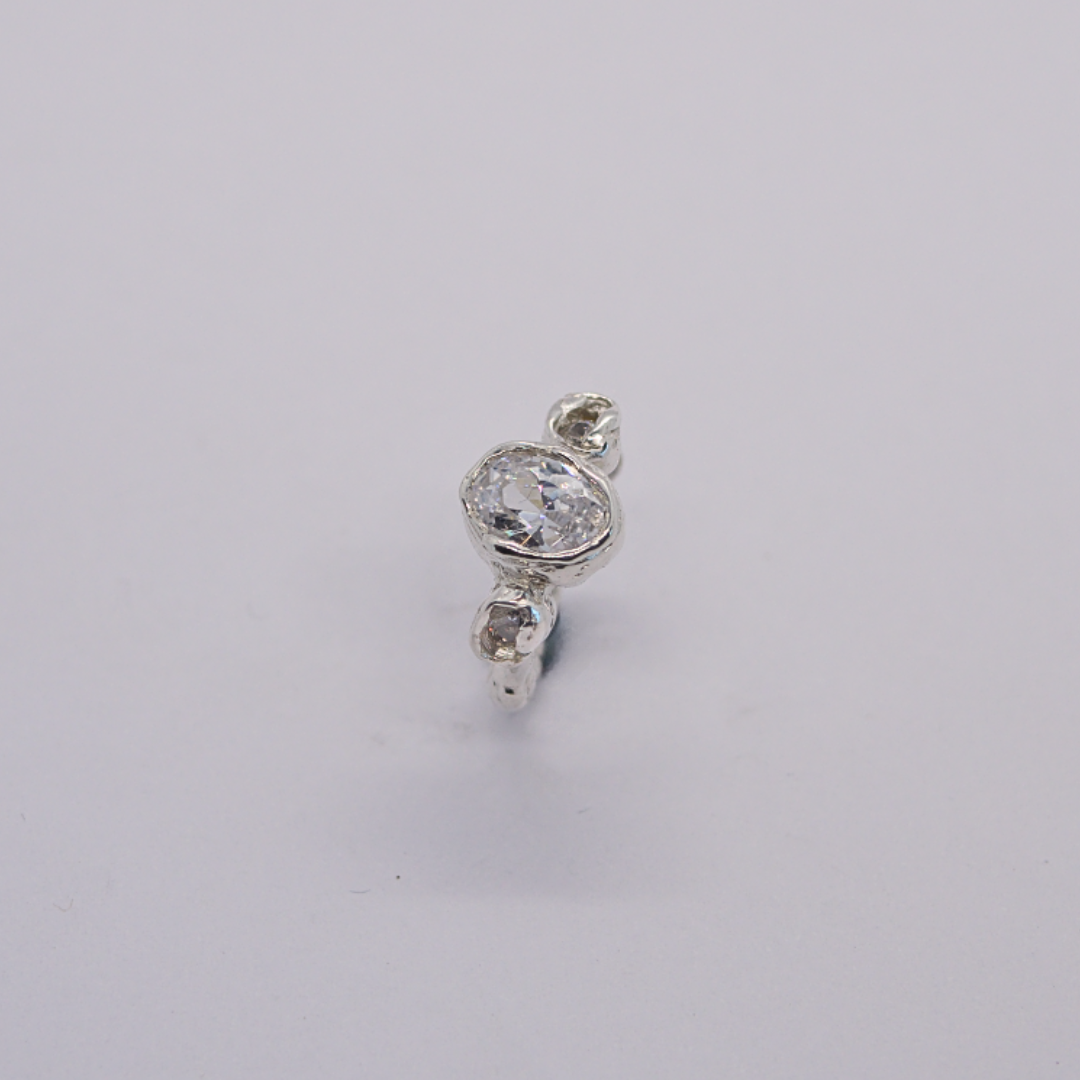 Anneau en argent 925 massif, serti de trois oxydes de zirconium. Disponible en taille 49-50.